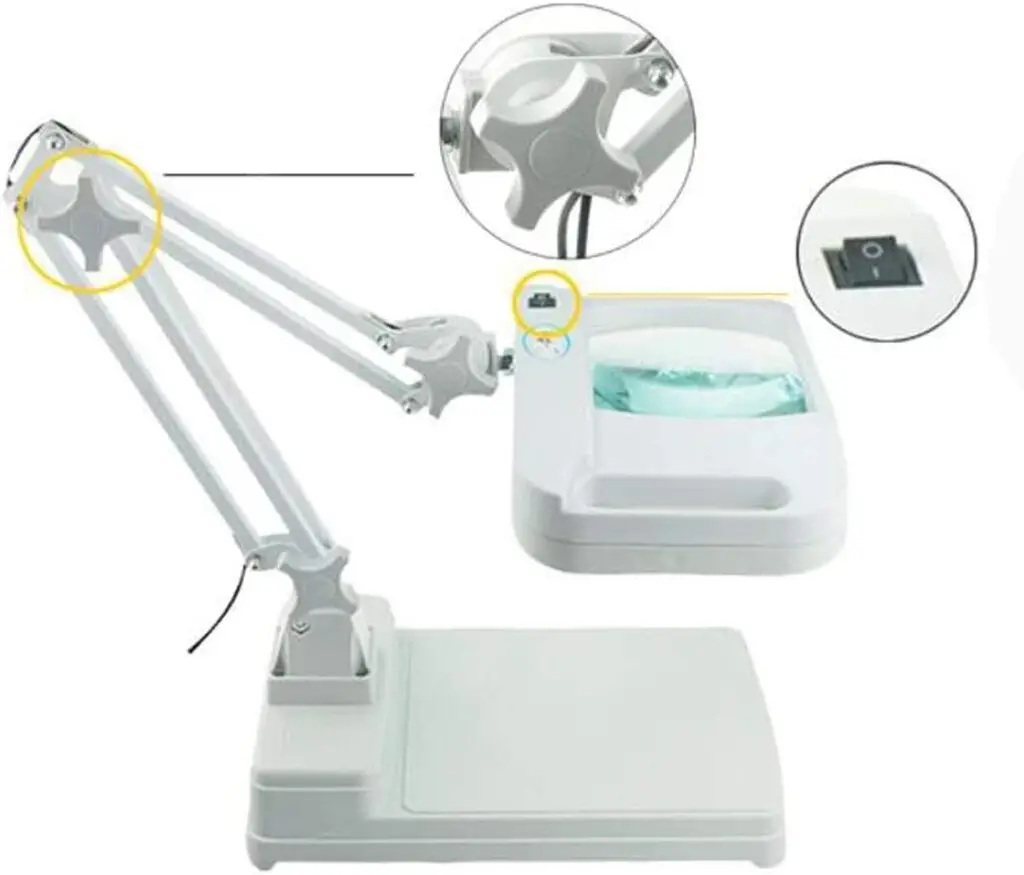 Ayaklı bu mükemmel büyüteçli lamba, okuma, çapraz bulmaca, dikiş, tığ işi, tığ işi, kanaviçe işi, boncuk işi, sanat ve zanaat, onarım elektroniği, ahşap işleri, mücevher yapımı veya ticari kullanım için mükemmeldir.