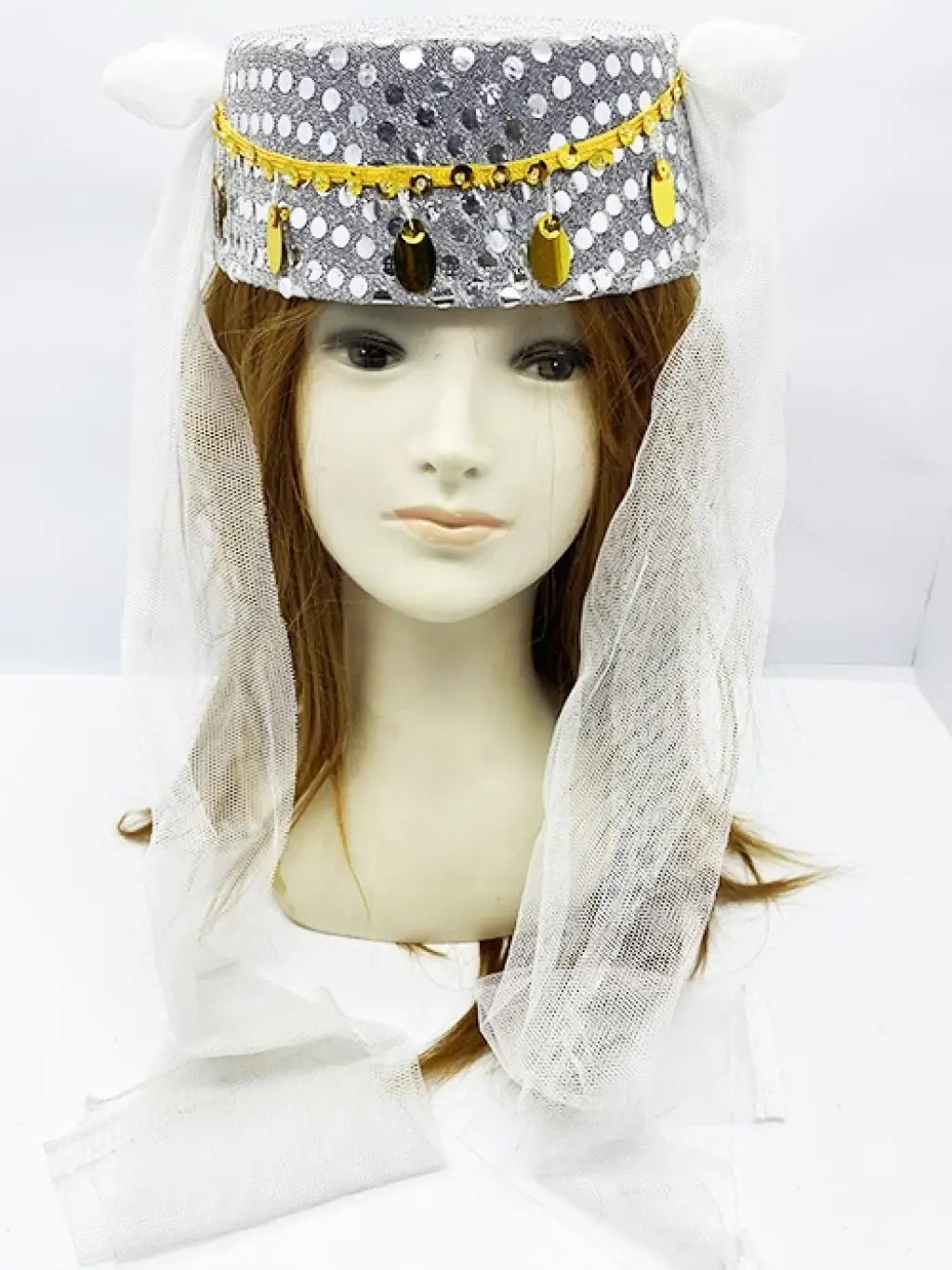 Beyaz Duvaklı Altın Pul İşlemeli Kına Fesi Kına Şapkası Oryantal Şapkası