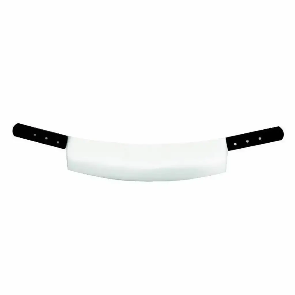 4. Çift Saplı Tasarım: Bıçağın çift saplı tasarımı, daha iyi denge ve kontrol sağlar. İki sap, bıçağın kullanımını daha rahat hale getirir, özellikle büyük et parçalarını keserken ekstra kontrol ve stabilite sunar. Saplar ergonomik olarak tasarlanmış olup, elinize tam oturur ve uzun süreli kullanımlarda konfor sağlar. Genellikle kaymaz özellikte olan saplar, bıçağın güvenli bir şekilde tutulmasını sağlar.