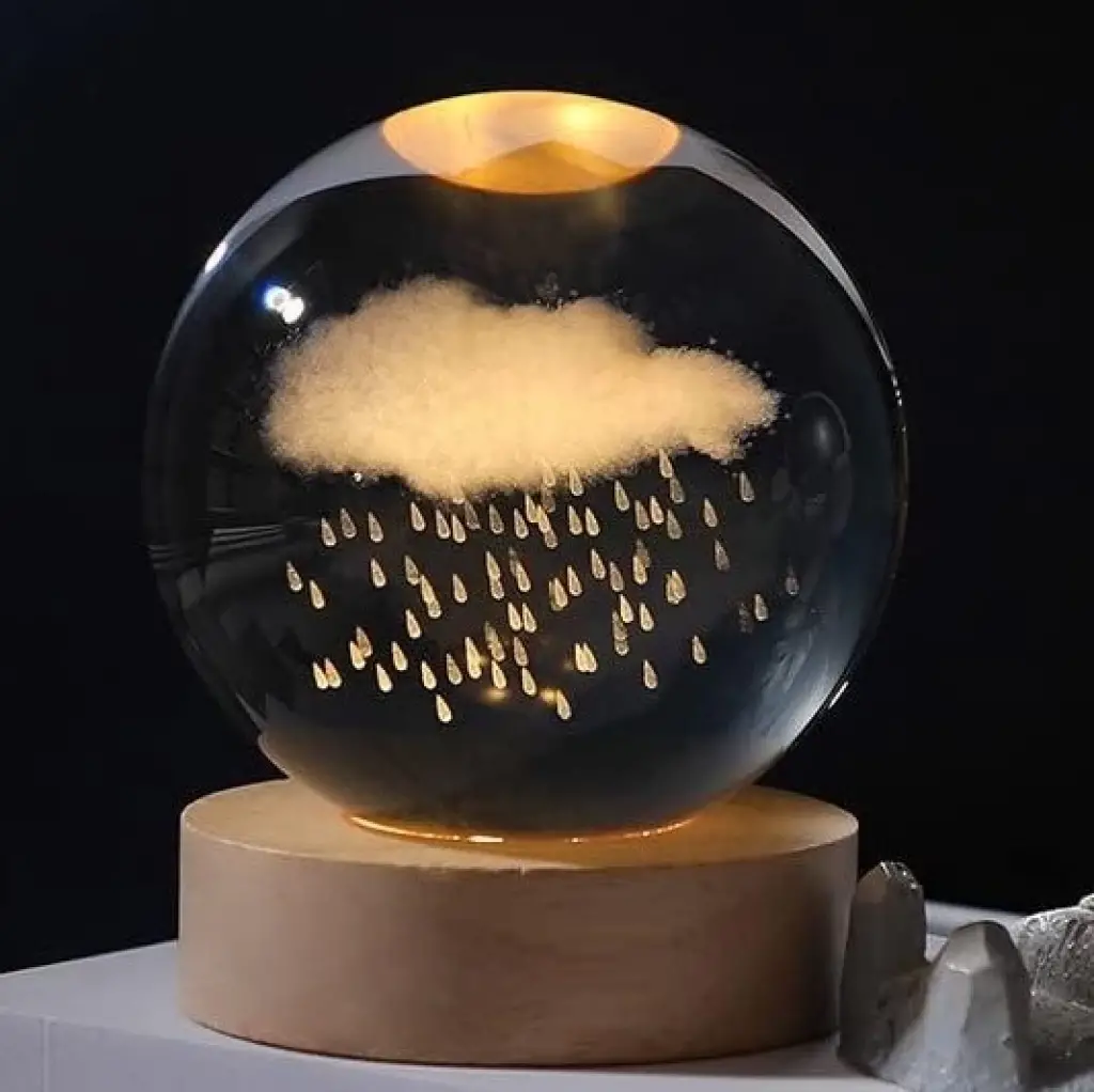 Dekoratif Bulut ve Yağmur Tasarımlı Ahşap Altlıklı Işıklı Cam Küre