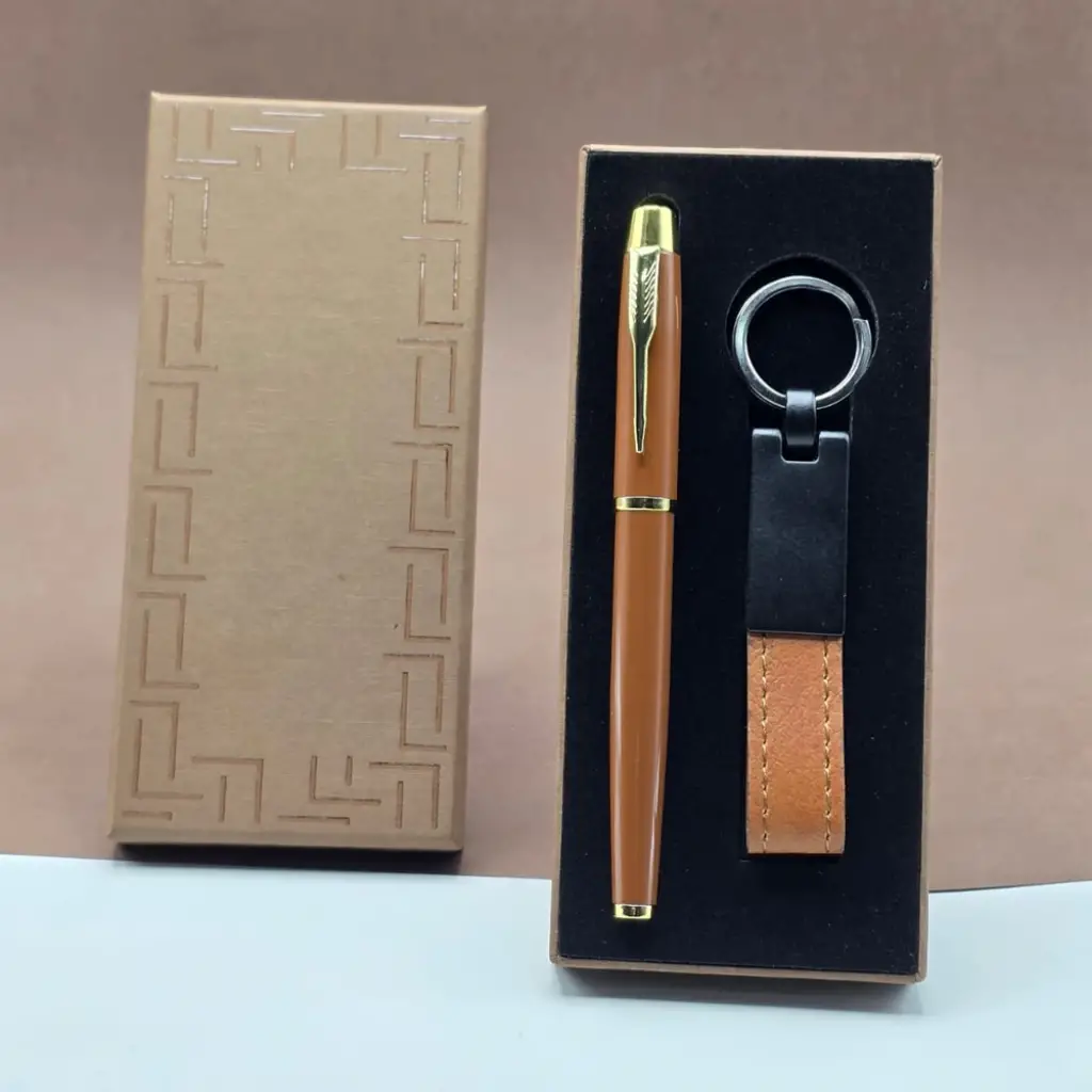 Kutu içinde bulunan kahverengi kalem ve anahtarlık set oldukça dikkat çeken setlerden.