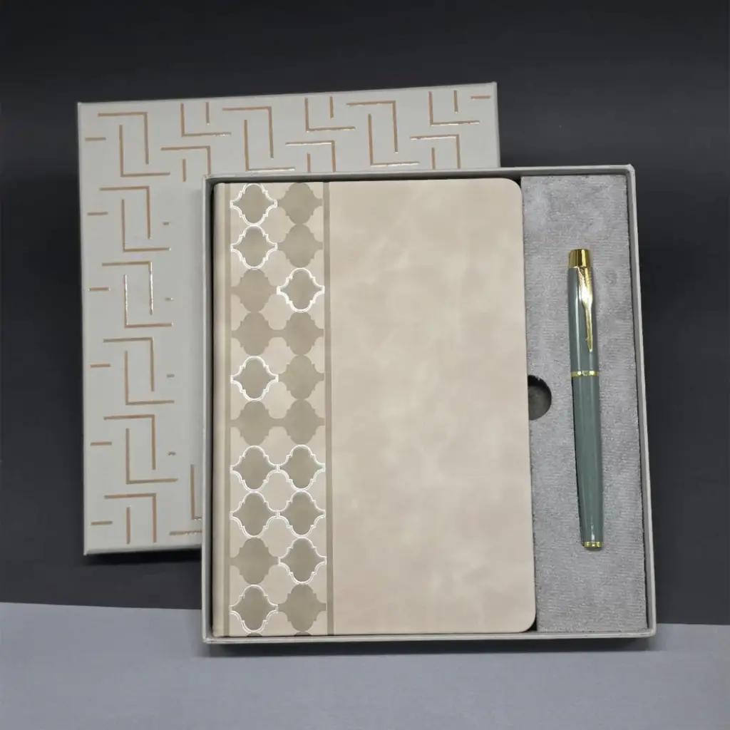 Özel tasarım kutusu ile birlikte defter kalem şık bir görünüme sahip olmakta olup kutu kalem ve deftere baskı yapabilir ve hediyeyi daha anlamlı bir hale getirebilirsiniz.