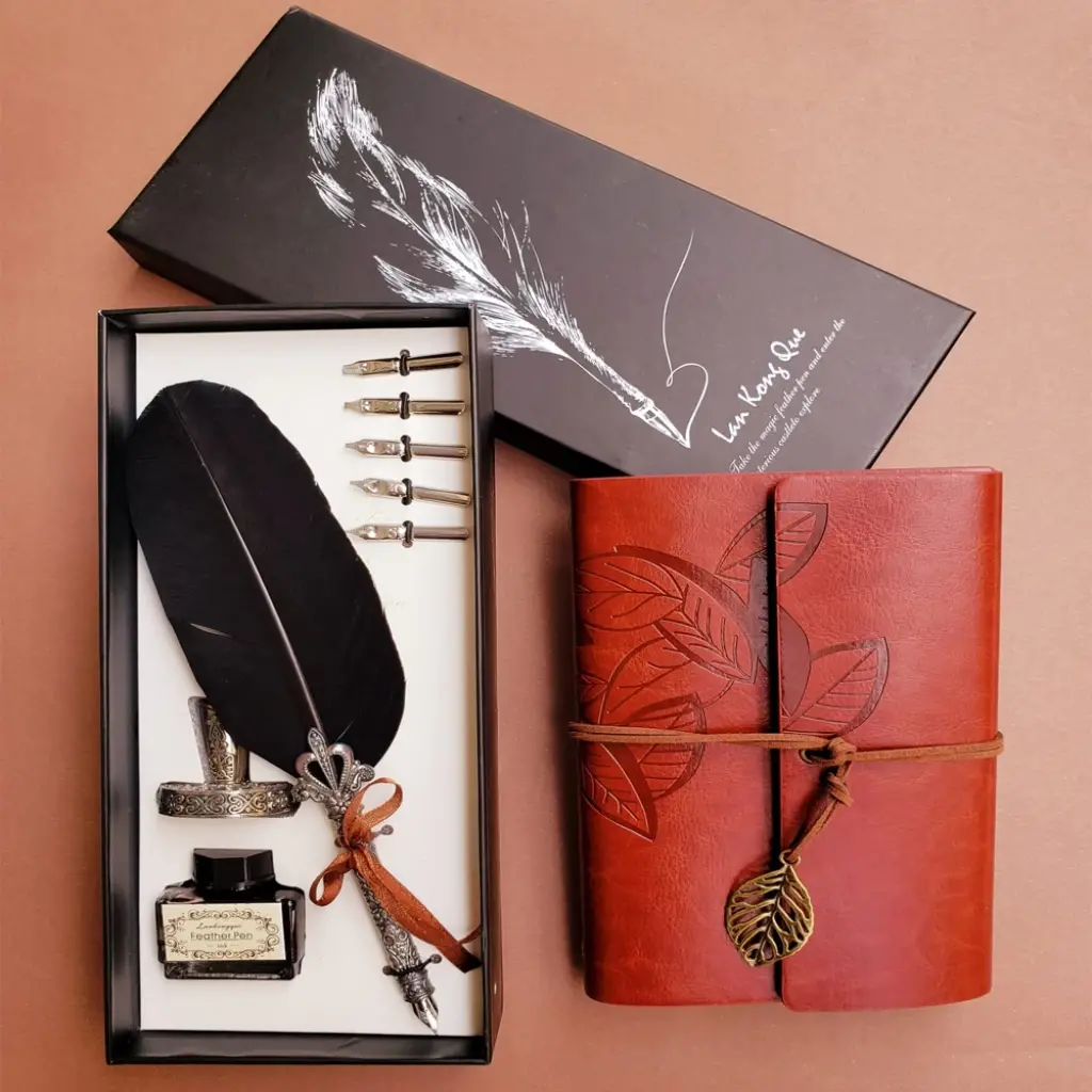 Tüylü Divit Kalem Seti ve Yaprak Tasarımlı Deri Defter İle Set Özel Bir Hale Geliyor.