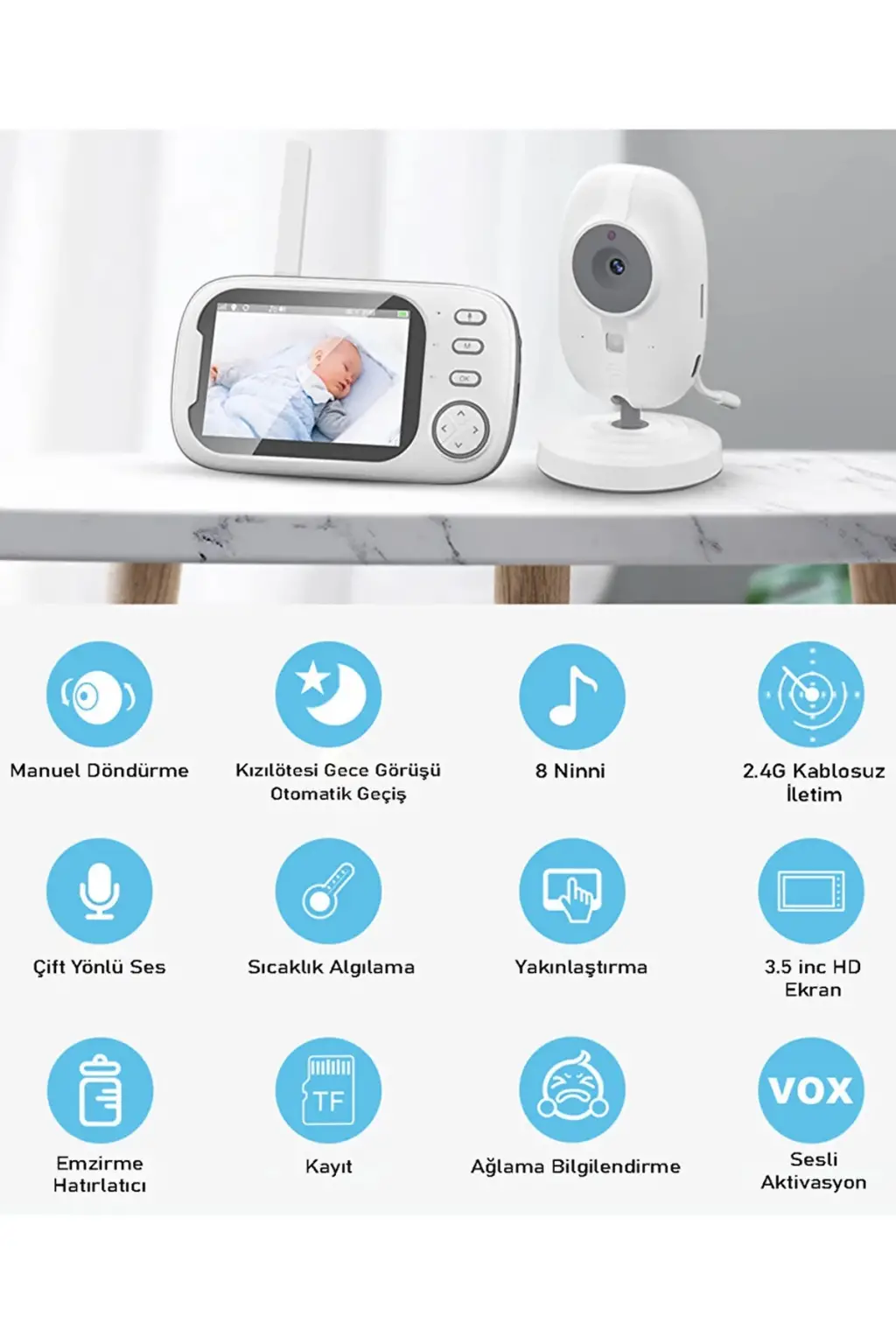 • Kızılötesi gece görüş özelliği ile en karanlık ortamlarda bile en iyi görüntüyle bebeğinizi takip edin. Ağladığında devreye giren sensor sayesinde istediğiniz zaman güvenliğini sağlayabilirsiniz. Çift yönlü ses görüşmesi sayesinde çocuğunuza komut verebilirsiniz. Oda sıcaklığını istediğiniz seviyede tutmak için uyarıcı özelliğini aktif edebilirsiniz. Tüm görüntüleri kartınıza kaydedip daha sonra tekrar izleyebilirsiniz.