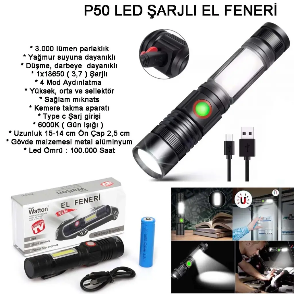 Geniş Açılı P50 Led Şarjlı El Feneri Wt-601