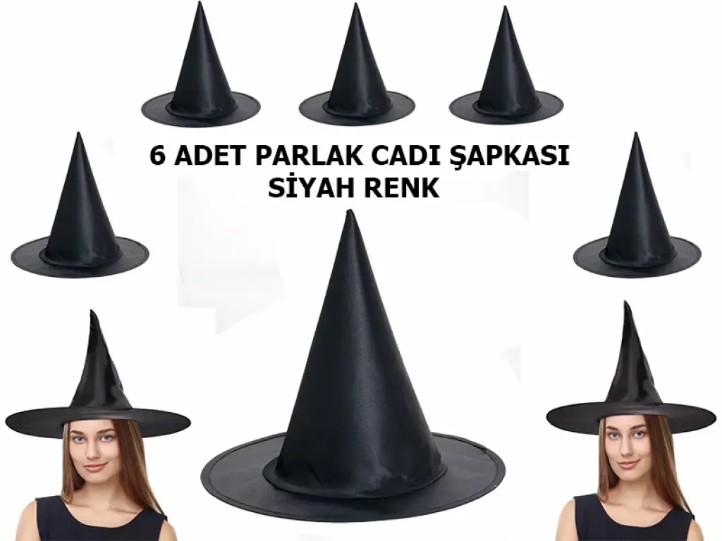 Halloween Siyah Renk Parlak Dralon Cadı Şapkası Yetişkin Ve Çocuk Uyumlu 6 Adet