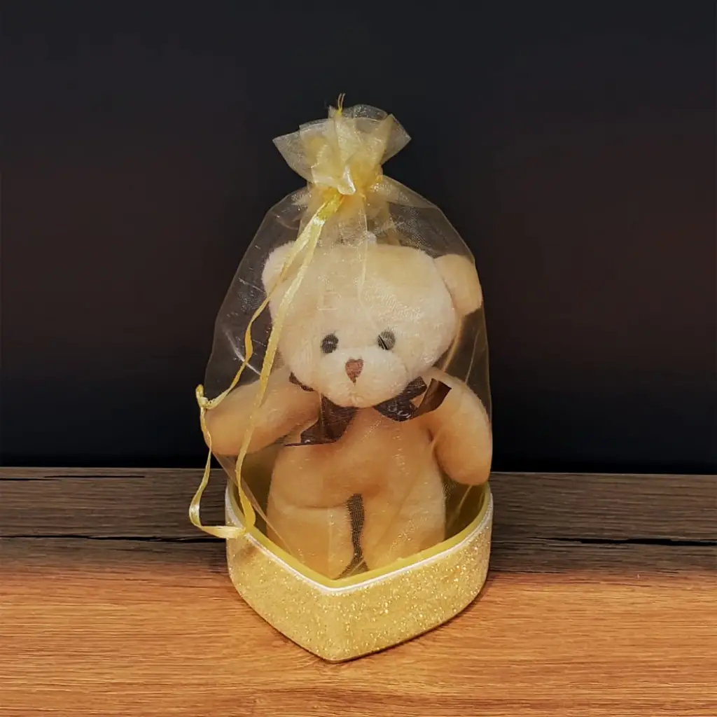 Tül kese içinde bulunan ayıcık ile özel günlerde hediye verebileceğiniz hazır hediyeliklerden.