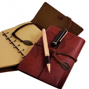 Ahşap Kutulu Kahve Deri Defter Ve Metal Bakır Kalem