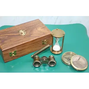Ahşap Kutulu Pirinç Pusula,kumsaati,dürbün Seti 15682