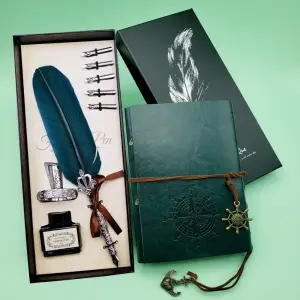 Deri Defter Ve Tüylü Mürekkepli Kalem Seti