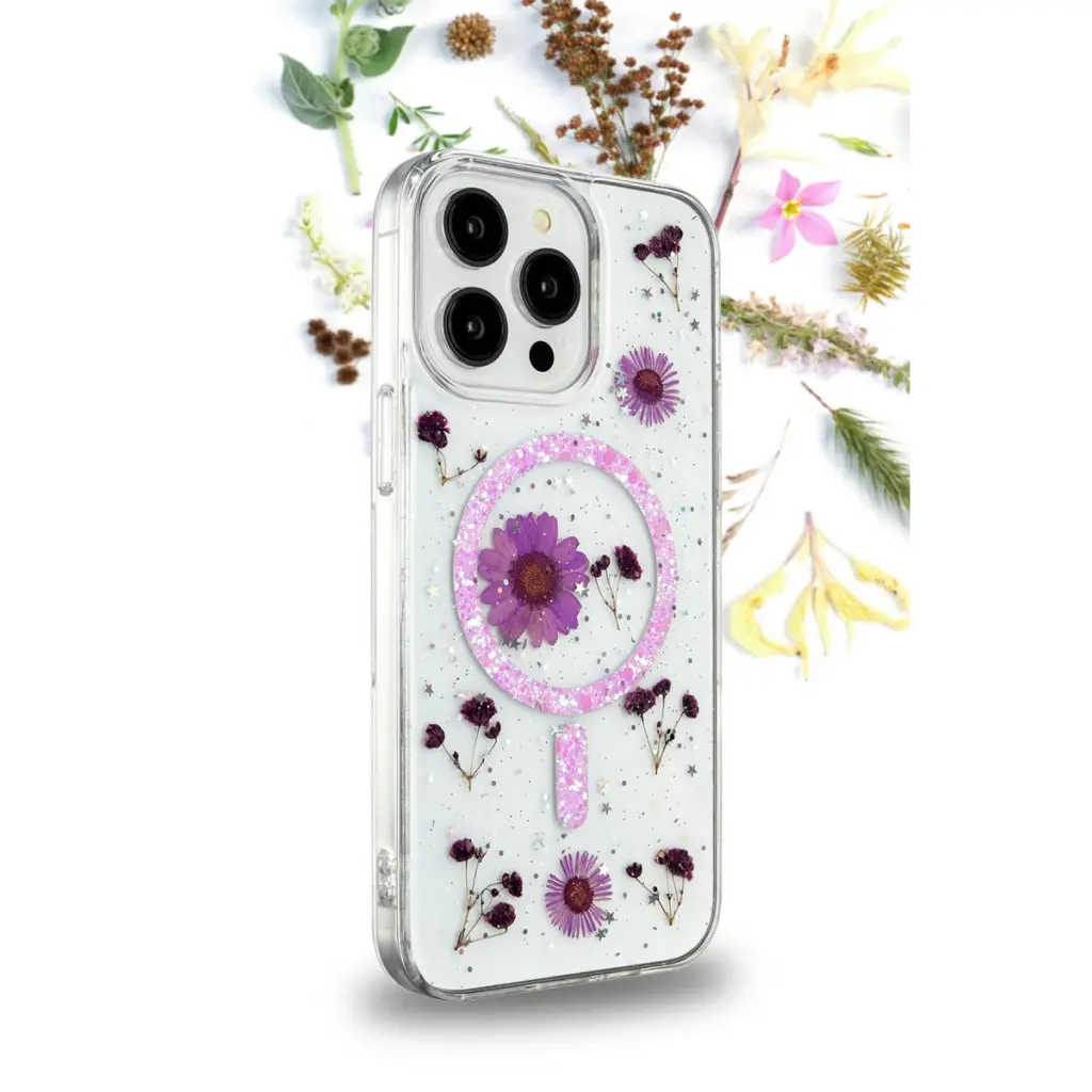 Daisy Simli MagSafe Kapak, doğanın zarafetini ve sadeliğini yansıtan, içinde gerçek çiçeklerin bulunduğu eşsiz bir tasarıma sahiptir. Kapak, içindeki gerçek papatya çiçekleri ve simli arka planı ile cihazınıza doğal bir güzellik katarken, her kapak kendi içinde benzersizdir. Bu, telefonunuzu hem korurken hem de ona kişisel bir dokunuş ekler.