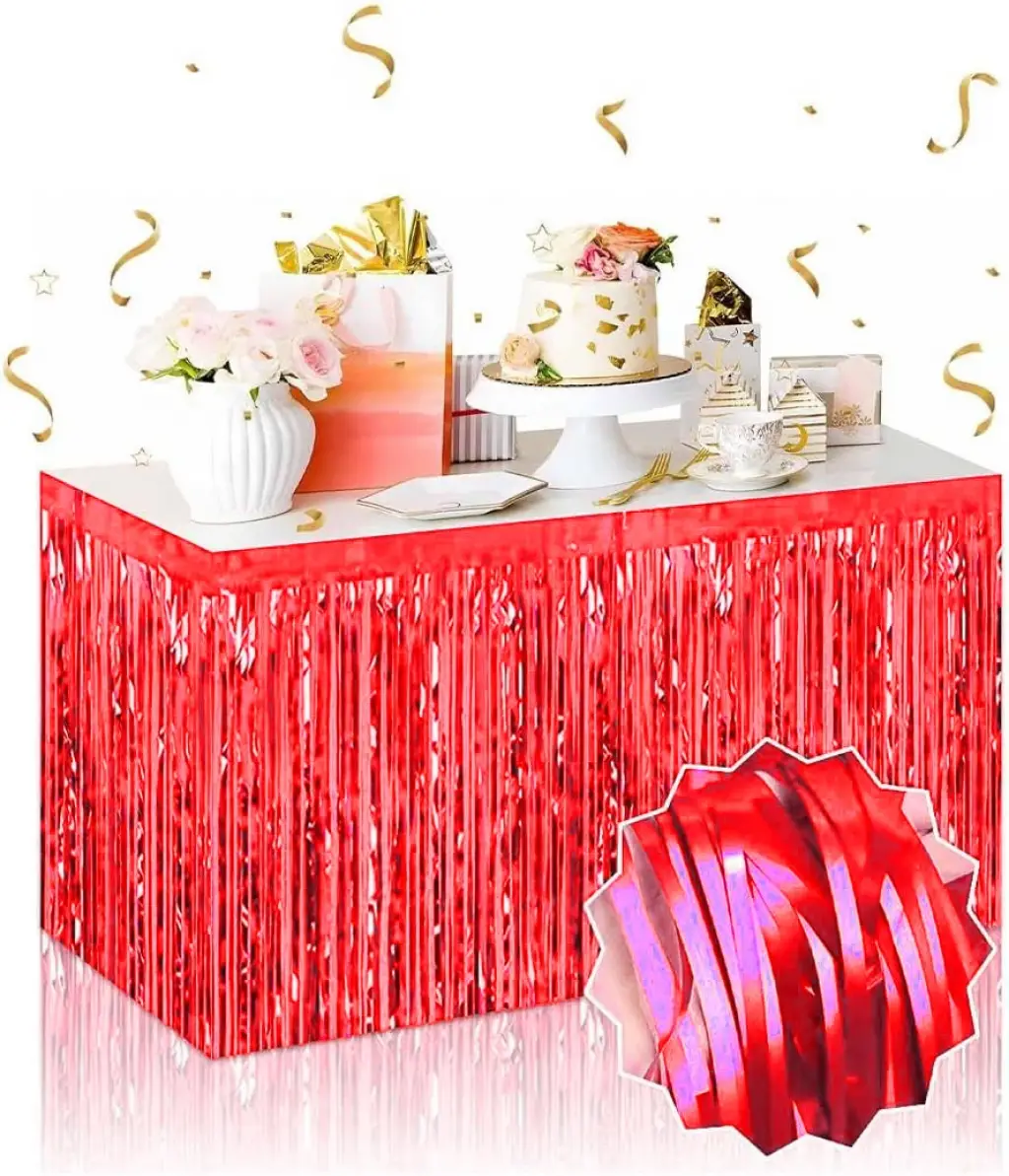 Canlı kırmızı tonuyla partinize enerji ve şıklık katın 75 x 275 cm ölçülerindeki kendinden yapışkanlı kırmızı metalize püsküllü masa eteği, doğum günü, yılbaşı, sevgililer günü, mezuniyet, nişan ve tüm kutlamalarda masa dekorasyonunuzu tamamlar.