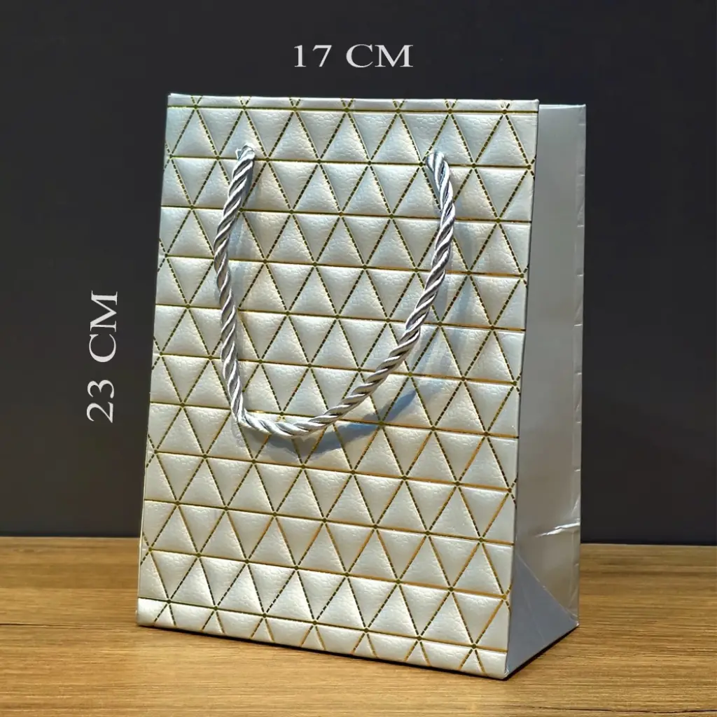 Küçük boy gri ve gold renkli hediye çantası şık tasarım ve özel tasarımı ile özel günlerin vazgeçilmez çantalarından.