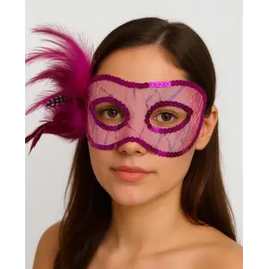 Fuşya Renk Yandan Tüylü Pul Payet İşlemeli Parti Maskesi 23x12 Cm