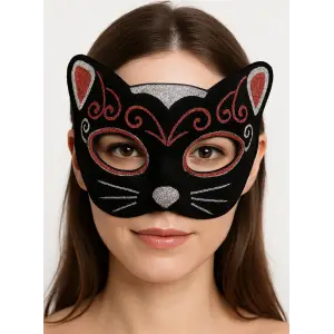 Kadife Dokulu Sim Detaylı Işıltılı Kedi Maskesi Kırmızı Gümüş 20x13 Cm