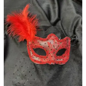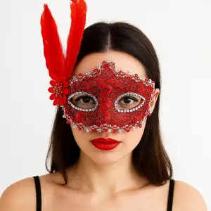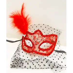 Kırmızı Renk Yandan Tüylü Güllü Gümüş Taşlı Pullu Maske 20x22 Cm