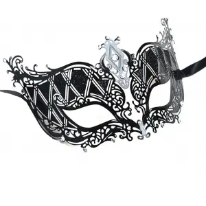 Kristal Gümüş Taşlı Siyah Renk Lazer Kesim Metal Lüks Maske Balo Parti