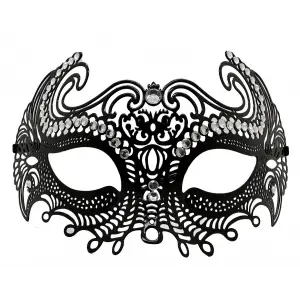 Siyah Renk Lazer Kesim Üzeri Kristal Taşlı Metal Balo Parti Venedik Maskesi
