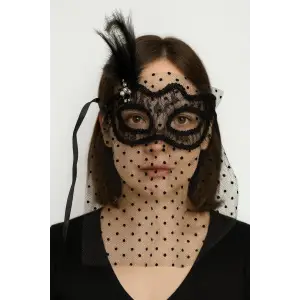 Siyah Renk Siyah Puantiyeli Duvaklı İncili Parti Maskesi