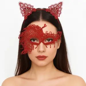 Kırmızı Dantel Kedi Maskesi Ve Dantel Taç Seti 8 No – Kadın Kostüm Aksesuarı