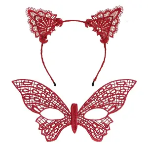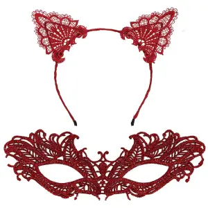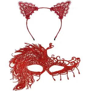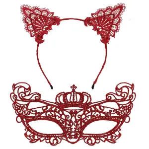 Romantik Kırmızı Dantel Maske Seti – Kedi Kulaklı Taç Ve Maske 3 No