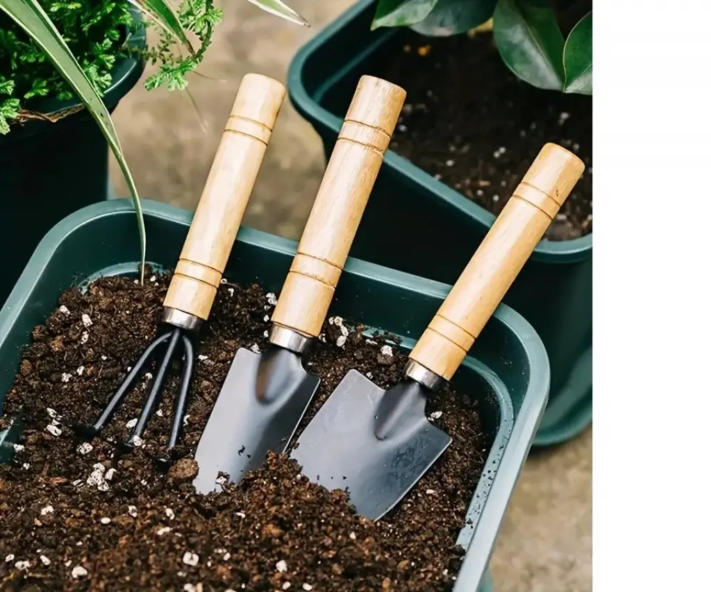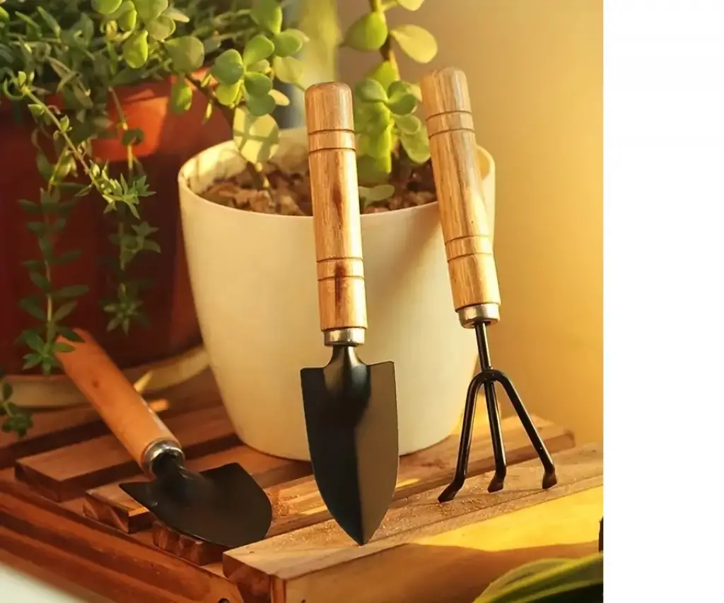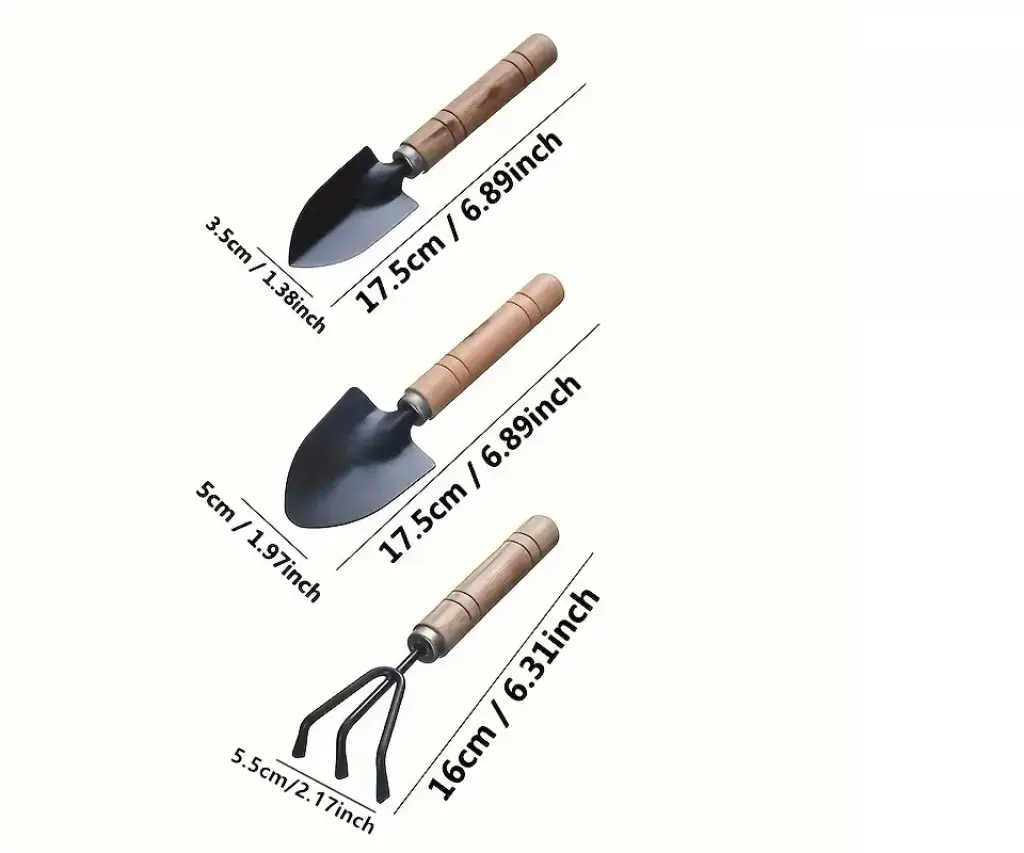 3 parça mini bahçe alet seti, tohum ekmek, sukulentler ve saksı malzemeleri için ahşap saplı çiçek tırmığı ve küçük kürek.