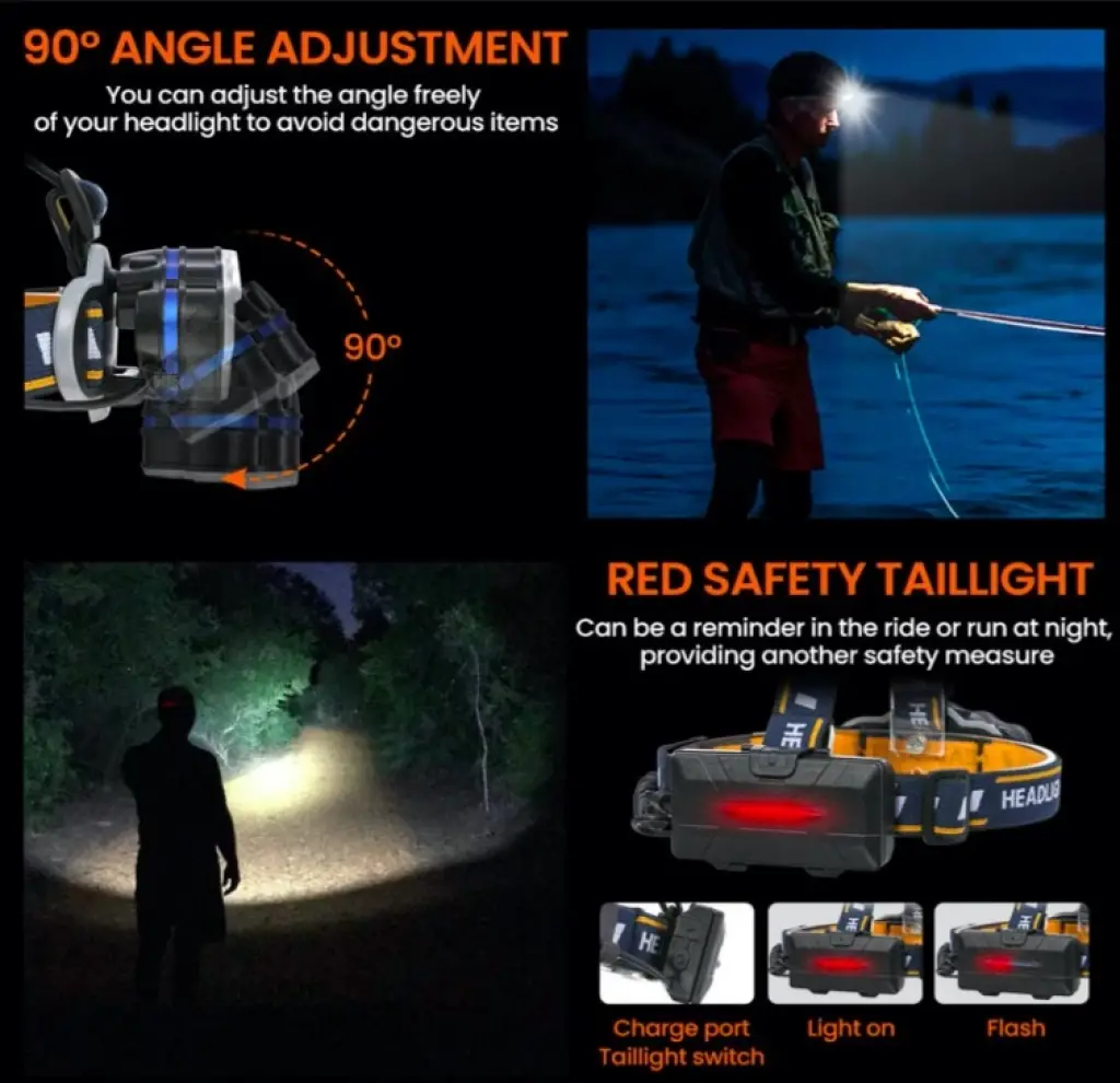 ULTRA parlak ve uzun ömürlü: Kafa Lambası, 8 LED ampul ve maksimum parlaklık 2000 lümen ve aydınlatma aralığı 500 metre olan kırmızı bir emniyet lambasından oluşur. Çevreyi açıkça görmenize ve tehlikeden uzak durmanıza yardımcı olur. Daha güçlü bir parlak ve daha uzun ömür sağlamak için bir USB hattı ve 2 şarj edilebilir pil ile birlikte gelir.