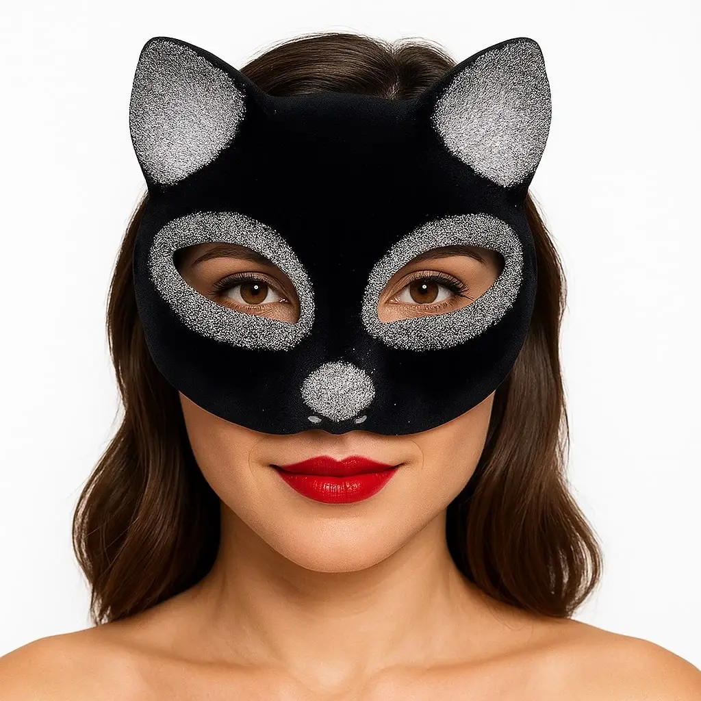 Siyah Renk Gümüş Simli Süet Kedi Maskesi ile sevimli ve eğlenceli bir görünüm oluşturun ve özel günlerinizi unutulmaz kılın