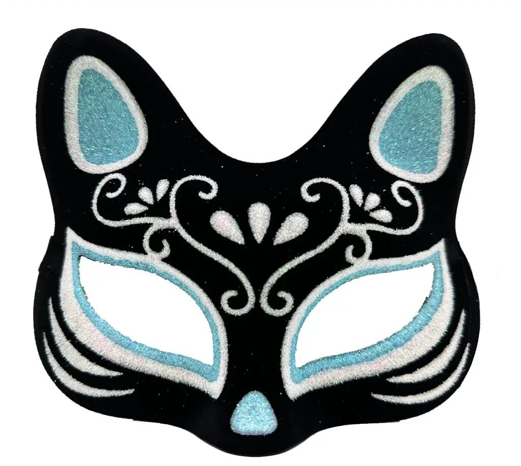 Siyah Renk Üzeri Gümüş Mavi Simli Süet Kaplama Kedi Maskesi ile gizemli ve etkileyici bir görünüm oluşturun ve Kostüm Partisine hazır olun