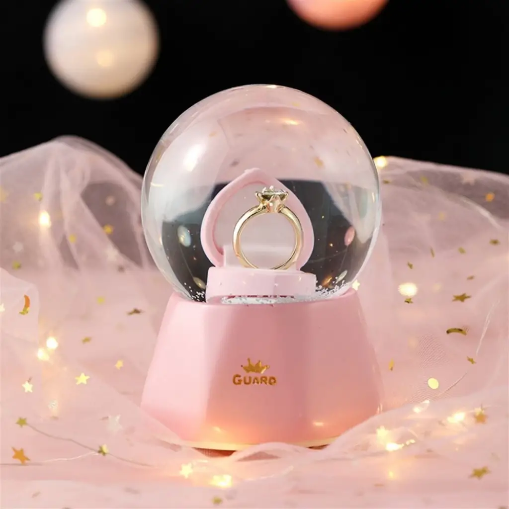 büyük boy tek taş yüzük tasarımlı kar küresi ışıklı olup müzik çalarken renk değiştirmektedir.