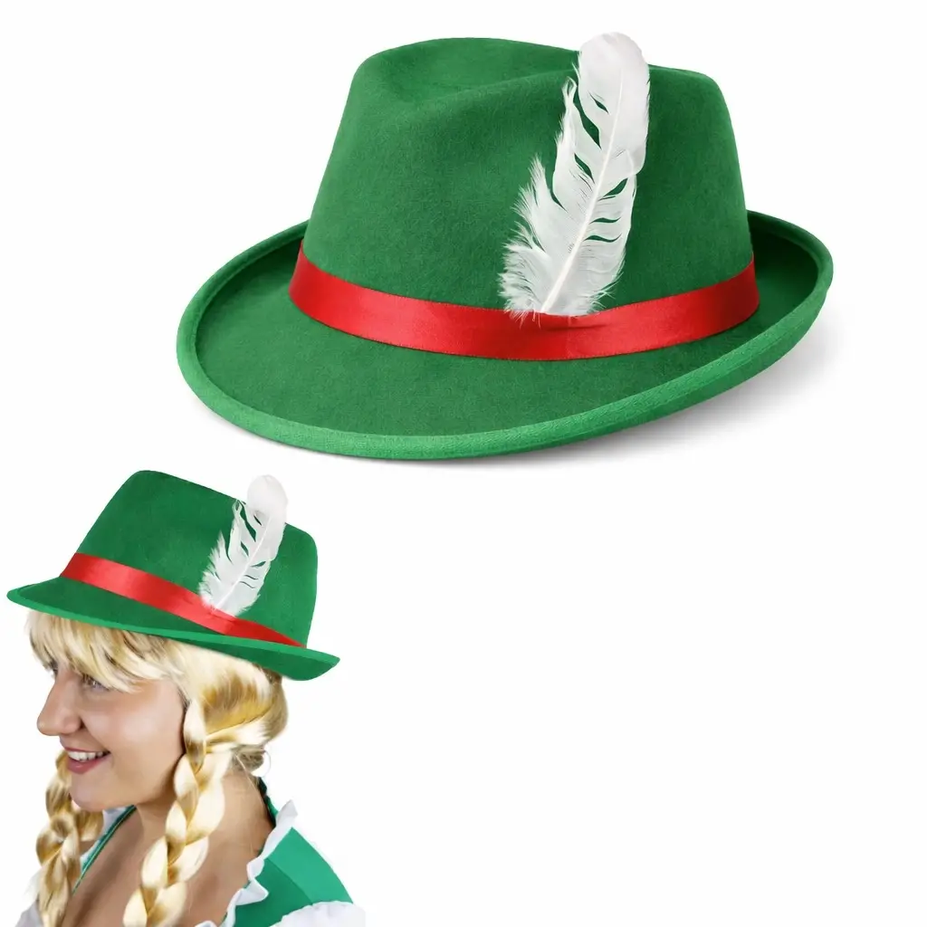 Alman Bavyera tarzından ilham alan bu yeşil tüylü şapka, eğlenceli etkinlikler ve temalı partiler için dikkat çekici bir kostüm aksesuarıdır. Üzerindeki kırmızı kurdele ve beyaz tüy detayı sayesinde klasik Alman görünümünü tamamlar.
